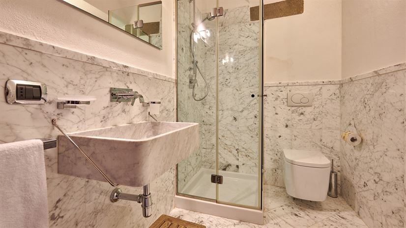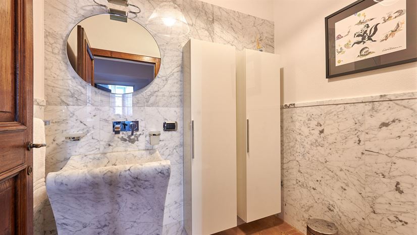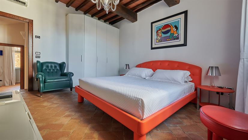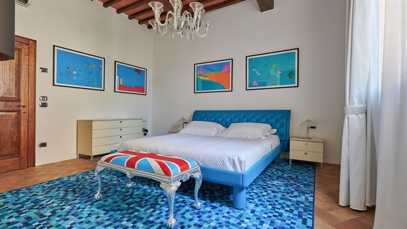 Inside, original features such as vaulted ceilings, terracotta floors, and wood-beamed ceilings have been meticulously preserved. These traditional elements contrast beautifully with the stylish, contemporary décor created by a Milan-based award-winning interior designer. High-quality furniture and carefully chosen color accents result in a refined yet homely ambiance.