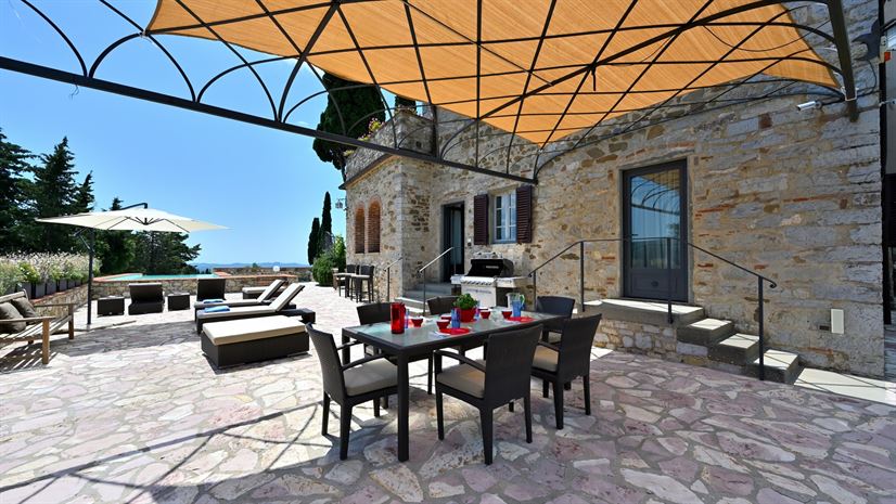 The location is wonderfully peaceful, set in the countryside with sweeping vineyard and olive grove views. The apartment spans the ground and first floors. A generous furnished terrace with dining area sits just outside, inviting open-air meals and relaxation. The private pool is adjacent and perfect for unwinding.