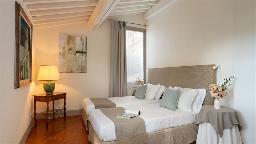 Twin beds (can be converted to a double), bedside tables, wardrobe, luggage stand, chair, air-conditioning.