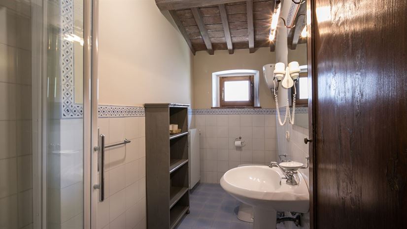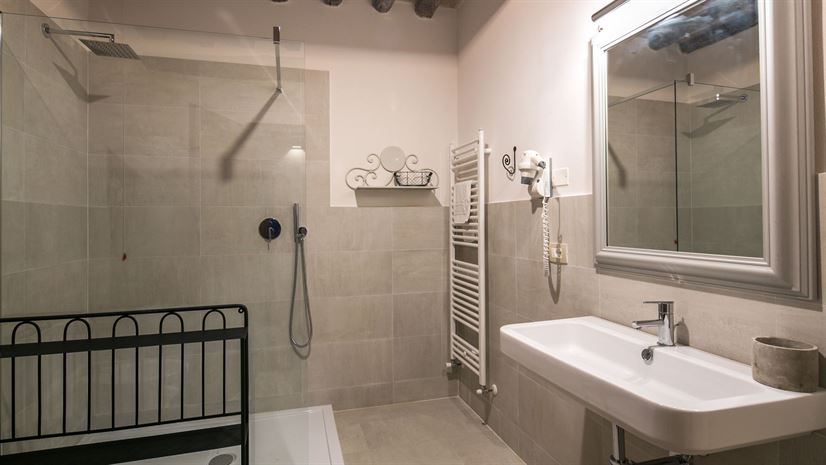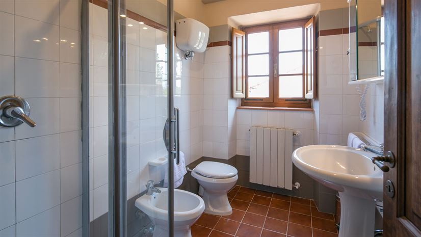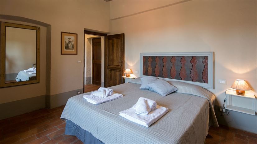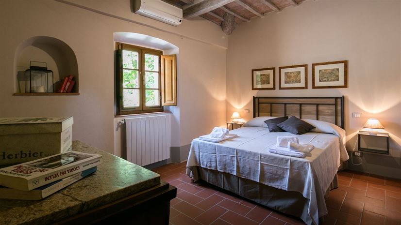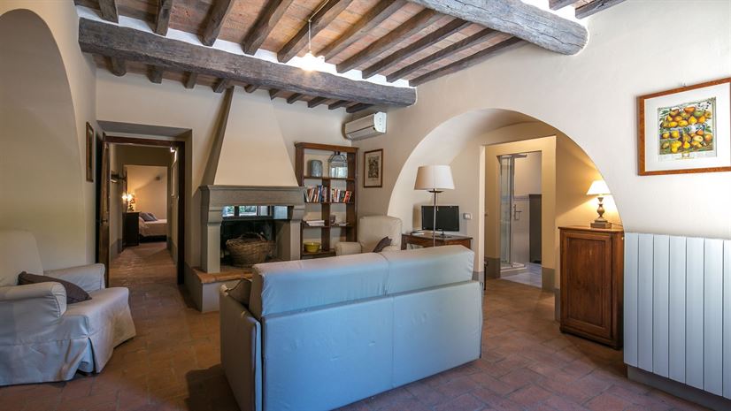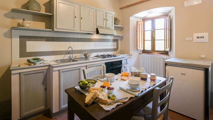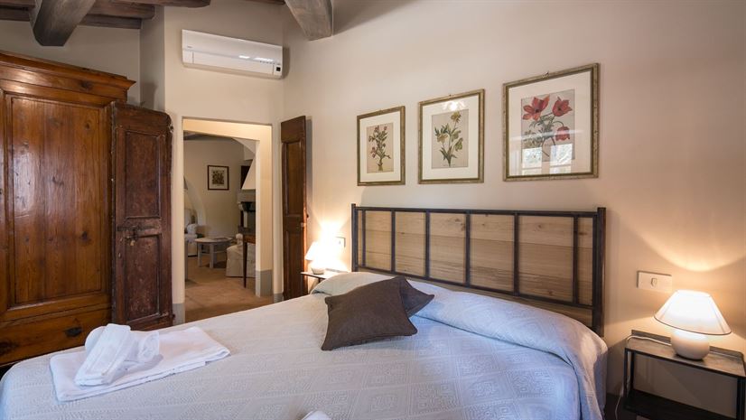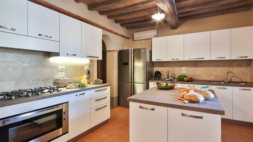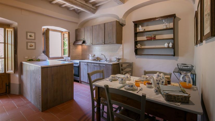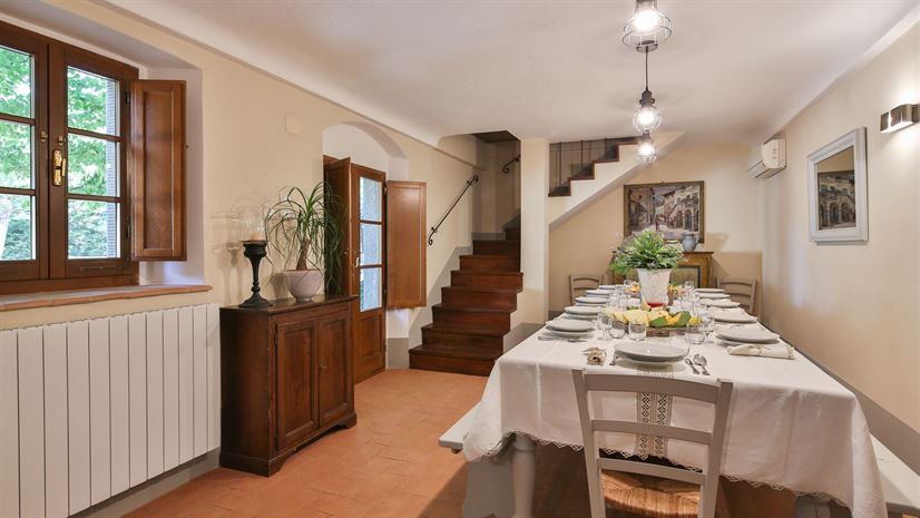 Inside, the villa has been thoughtfully restored, preserving traditional Tuscan features such as wooden beamed ceilings and terracotta floors. Soft neutral wall colours enhance the warm and welcoming atmosphere. The spacious kitchen-diner opens directly onto the terrace, creating a seamless flow between indoor and outdoor living. For guests who value a bit more privacy, there are two separate apartments, each with a kitchen-diner, accessible via an external stone staircase on the side of the villa.