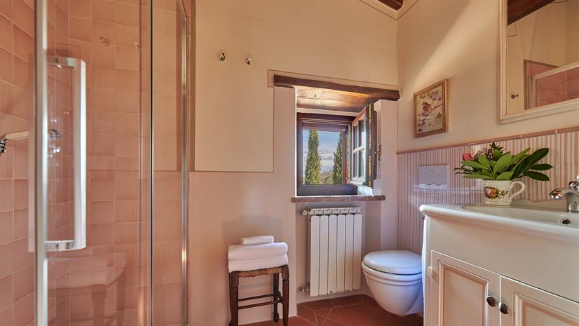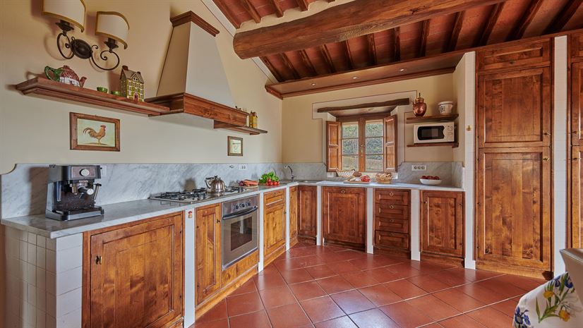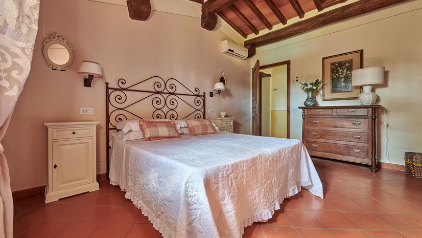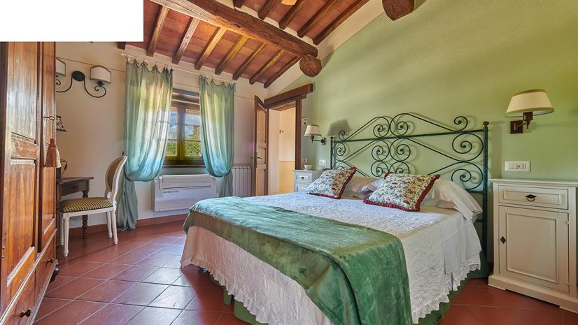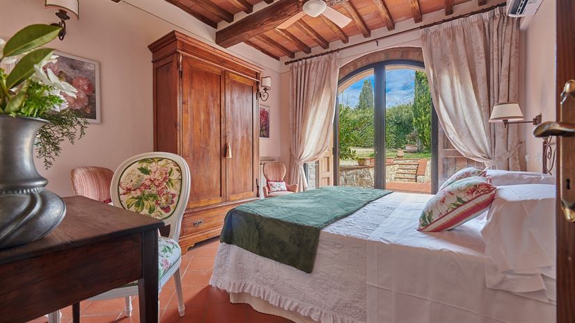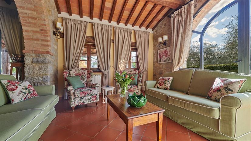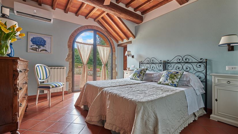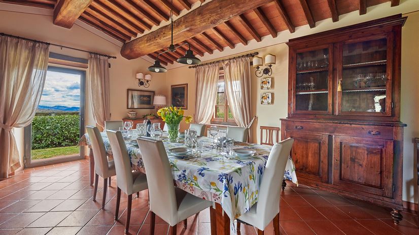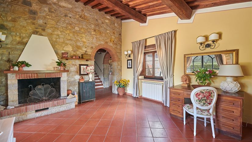 Inside, the villa combines traditional Tuscan elements such as terracotta floors and wood-beamed ceilings with a cosy and stylish interior. The result is a welcoming atmosphere where guests can unwind and enjoy the beauty of the Chianti countryside.