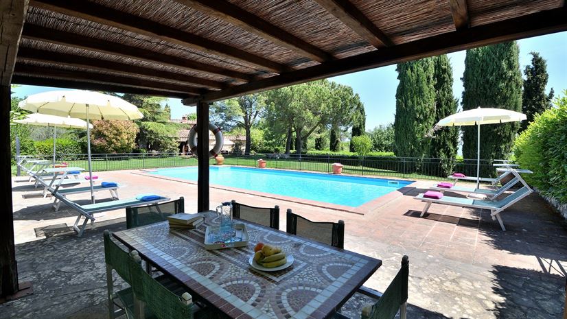 Casino di Vescine is a charming Chianti country house in a peaceful, private setting surrounded by olive groves and the gentle green hills of the region. This traditional Tuscan property offers the ideal space for a relaxing holiday with family or friends. The large, well-maintained garden is dotted with mature trees, flowering plants, and inviting corners for dining and lounging outdoors. A particular highlight is the fenced swimming pool, making it especially suitable for families with young children.