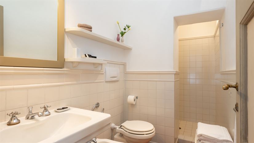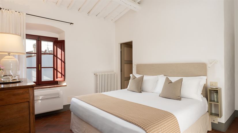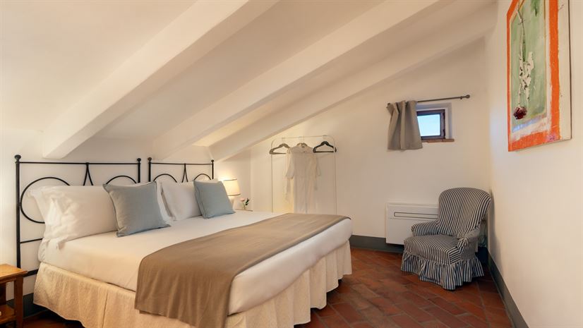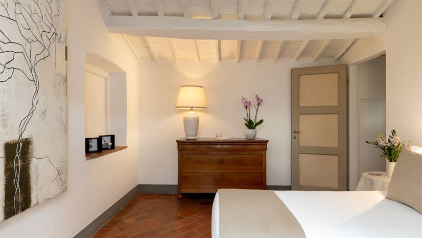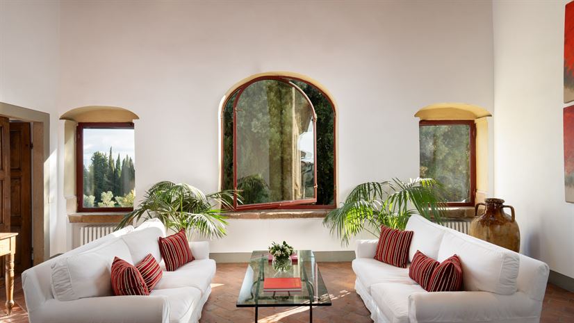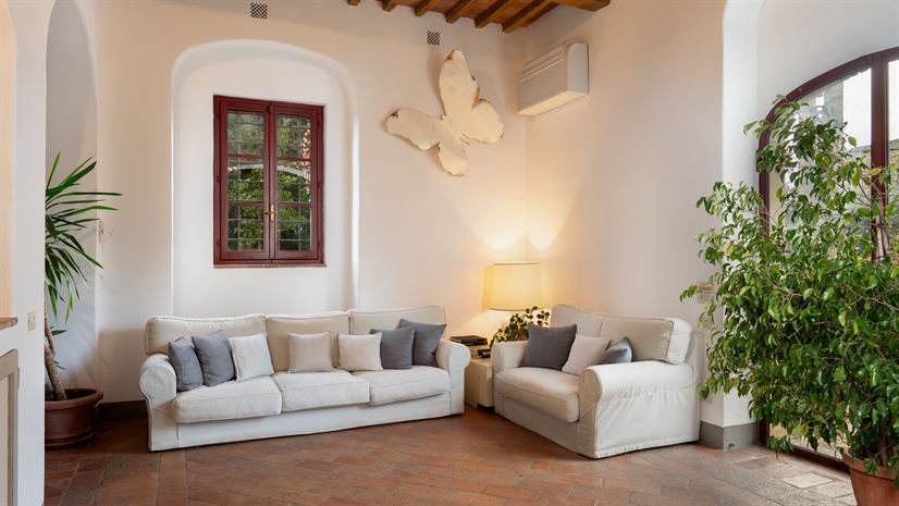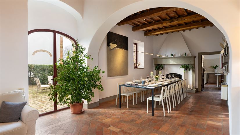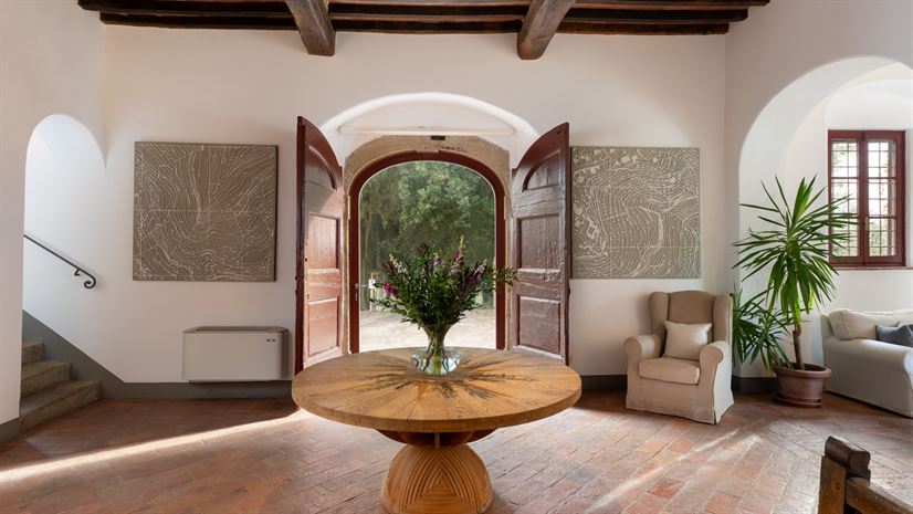 Inside, the villa feels bright and spacious. Original features such as terracotta floors, fireplaces and beamed ceilings have been preserved. Modern art and mainly contemporary furniture, complemented by selected antiques, create a welcoming atmosphere.