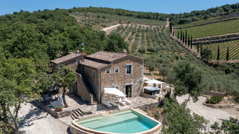 Castellare Petroso is a luxuriously restored Tuscan farmhouse in a peaceful location near the medieval hamlet of Colle Petroso. Surrounded by vineyards and olive groves, it is perfect for a relaxing holiday with family or friends. A special feature is the adjacent Etruscan archaeological site, adding a unique historical dimension to the setting. The well-maintained outdoor area includes a pool and a whirlpool, offering the perfect spot to unwind and enjoy the stunning landscape of the Chianti Classico.