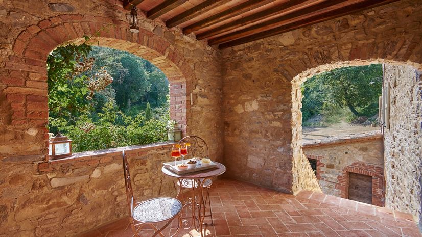 The apartment is located on the first and second floors. A private balcony off the master bedroom overlooks the surrounding landscape. Inside, original Tuscan features such as terracotta floors and beamed ceilings blend with elegant furnishings, modern bathrooms, French-style beds and linen-covered armchairs.
