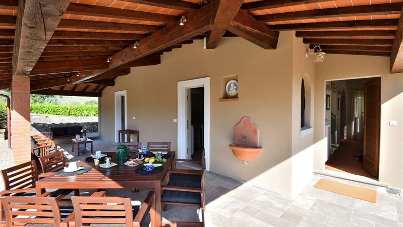The three terraces at Le Piaggiole are set beneath a pair of sheltered pergolas. The front terrace features a wooden table and chairs. The rear terrace also features a wooden table and chairs, as well as a separate seating area with benches and a coffee table. The sight of the carefully aligned lush plants and flowers can be enjoyed from both of these pergolas. Another terrace is beside the pool, with a wooden table and chairs. On the first floor, there is a balcony with terracotta floors and iron barriers. The interior has the design of a cosy, but spacious country house, with antique furniture and high ceilings.