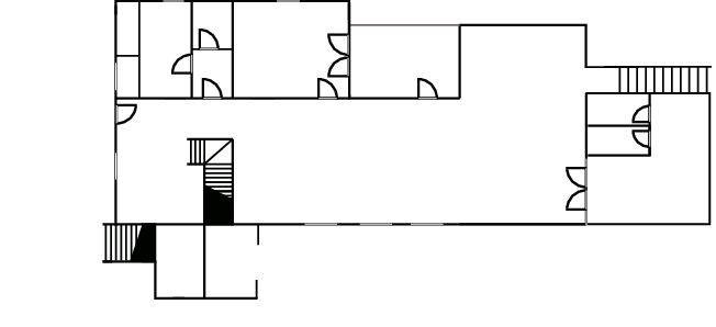 Sofa, table, bookshelf, side table, chair, stairs to first floor, main entrance.