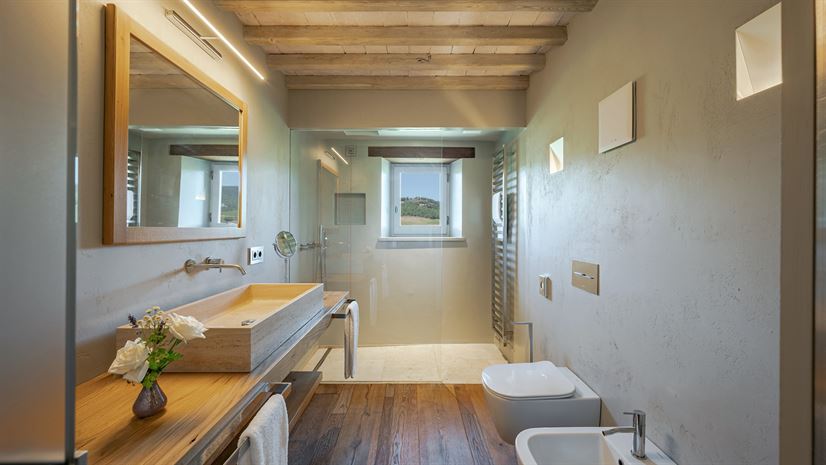 This two-storey stone villa features a lift, making it suitable for guests with limited mobility. Inside, the décor is stylish and welcoming, combining traditional Tuscan elements such as beamed ceilings, vaulted brick ceilings, and exposed stone walls with marble floors, high-end designer furnishings, and striking lighting features. A wellness area with steam room and gym, as well as a wine cellar where guests can taste wines from the Tenuta di Carleone estate, completes this exclusive offering.